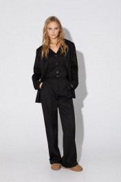 Укороченный жилет из костюмной ткани. Детали: жилет прямого силуэта с фигурным низом, талиевые вытачки, застежка на петли и пуговицы, функциональные карманы, на подкладке. Длина жилета по спинке около 39 см в размерах 40-46 и около 43 см в размерах 48-52
