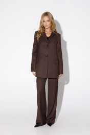 Текстильный костюм-двойка из трапециевидного жакета с высокой шлицей по спинке и прямых брюк со стрелками. Детали: свободный покрой, пиджачный воротник, талиевые вытачки, функциональный нагрудный карман, прорезные карманы с клапанами, застежка на пуговицы, спинка со средним швом и высокой шлицей, рукава втачные двухшовные, жакет на подкладке. Брюки с высокой посадкой на притачном поясе со шлевками, передние половины с небольшими застроченными мягкими складками и заутюженными стрелками, застежка на молнию и пуговицу, боковые карманы. Длина жакета по спинке около 74/76 см, длина рукава около 61 см. Длина брюк по боковому шву с поясом около 113/114,5 см.