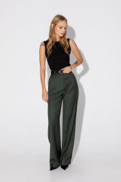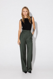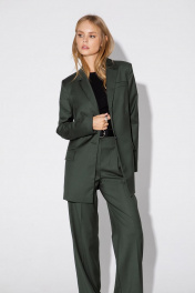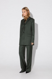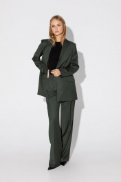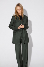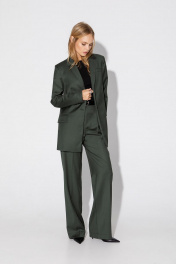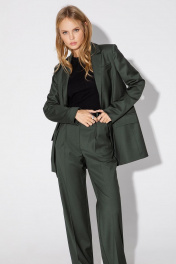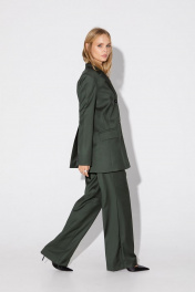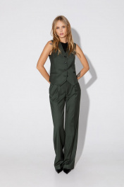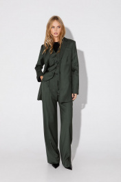 Текстильный костюм-тройка из трапециевидного жакета с высокой шлицей по спинке, полуприлегающего жилета и прямых брюк со стрелками. Детали: свободный покрой, пиджачный воротник, талиевые вытачки, функциональный нагрудный карман, прорезные карманы с клапанами, застежка на пуговицы, спинка со средним швом и высокой шлицей, рукава втачные двухшовные, жакет на подкладке. Жилет полуприлегающего силуэта, талиевые вытачками, застежка на петли и пуговицы, функциональные карманы, фигурный низ, на подкладке. Брюки с высокой посадкой на притачном поясе со шлевками, передние половины с небольшими застроченными мягкими складками и заутюженными стрелками, застежка на молнию и пуговицу, боковые карманы. Длина жакета по спинке около 74/76 см, длина рукава около 61 см; длина жилета по спинке около 48,5/51,5 см; длина брюк по боковому шву с поясом около 113/114,5 см
