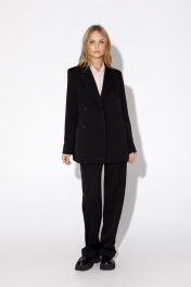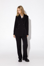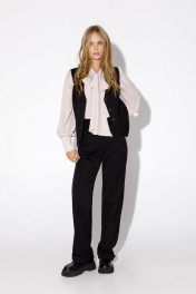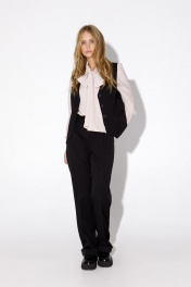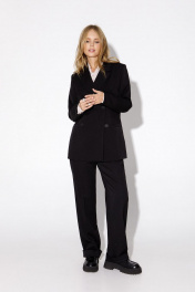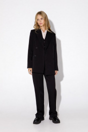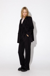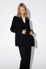Текстильный костюм-тройка из двубортного оверсайз жакета, полуприлегающего жилета и прямых брюк с высокой посадкой. Детали: жакет прямого силуэта, пиджачный воротник, прорезные карманы, спинка со средним швом, втачные двухшовные рукава, жакет на подкладке. Жилет с талиевыми вытачками, застежка на петли и пуговицы, функциональные карманы, фигурный низ, на подкладке. Брюки на притачном поясе со шлевками, передние половины с небольшими мягкими складками и заутюженными стрелками, застежка на молнию и пуговицу, боковые карманы. Длина жакета по спинке около 70 см в размерах 40-46 и около 73 см в размерах 48-52, длина рукавов около 62 см. Длина жилета по спинке около 48,5/51,5 см. Длина брюк по боковому шву с поясом около 112,5 в размерах 40-46 и около 114 см в размерах 48-52, длина по внутреннему шву около 80 см.