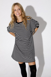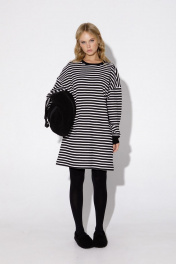 Свободное трикотажное платье-свитшот в полоску. Детали: прямой силуэт, спущенная линия плеча, круглая горловина переда и спинки, длинные рукава с манжетами, без застежки. Длина по спинке около 84 см в размерах 40-46 и 87 см в размерах 48-52, длина рукава+ плечо около 50+11= 61 см.