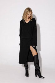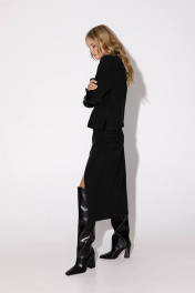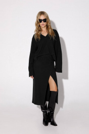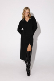 Трикотажный костюм-двойка из джемпера с V-образным вырезом и асимметричной юбки на запах. Детали: джемпер прямого силуэта, спущенная линия плеча, V-образный вырез переда, длинные рукава; низ рукавов, переда и спинки с небольшими разрезами по низу. Юбка с высокой посадкой, талиевые вытачки, потайная застежка в среднем шве спинки, высокий разрез, без подкладки. Длина по спинке около 47,5/51 см, длина рукава+ плечо около 56+5=61см; длина юбки по боковому шву около 78 см.