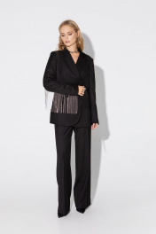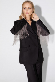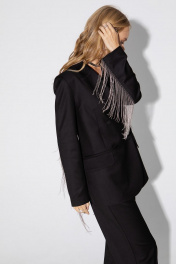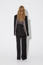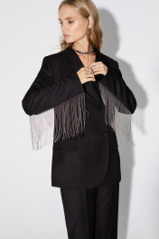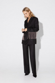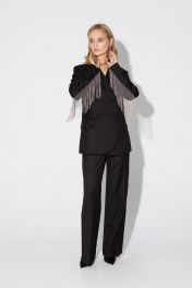 Текстильный костюм-двойка из двубортного жакета с отделкой в виде металлической бахромы и брюк-палаццо со стрелками.. Детали: жакет прямого силуэта, пиджачный воротник, прорезные карманы с клапанами, спинка со средним швом, втачные двухшовные рукава, жакет на подкладке. Брюки с высокой посадкой на притачном поясе со шлевками, застежка на молнию и пуговицу, боковые карманы, передние половины с заутюженными стрелками и двумя небольшими складками. Длина жакета по спинке около 68 см в размерах 40-46 и около 71 см в размерах 48-52, длина рукавов около 61 см. Длина брюк по боковому шву с поясом около 113 см в размерах 40-46 и около 114,5 см в размерах 48-52, длина по внутреннему шву около 82 см.