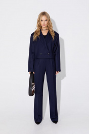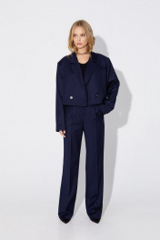 Костюм-двойка из укороченного оверсайз жакета с расширенными плечами и широких брюк- палаццо. Детали: прямой силуэт, спущенная линия плеча, пиджачный воротник, перед с функциональным нагрудным карманом, застежка двубортная на петли и пуговицы, рукава втачные двухшовные, жакет на подкладке. Брюки с высокой посадкой на притачном поясе со шлевками, передние половины с небольшими застроченными мягкими складками и заутюженными стрелками, застежка на молнию и пуговицу, боковые карманы. Длина жакета по спинке около 47 см в размерах 40-46 и около 49 см в размерах 48-52, длина рукава около 60 см. Длина брюк по боковому шву с поясом около 113/114,5 см.