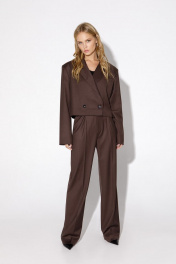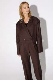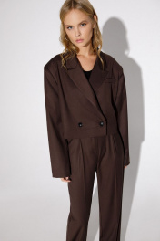 Костюм-двойка из укороченного оверсайз жакета с расширенными плечами и широких брюк- палаццо. Детали: прямой силуэт, спущенная линия плеча, пиджачный воротник, перед с функциональным нагрудным карманом, застежка двубортная на петли и пуговицы, рукава втачные двухшовные, жакет на подкладке. Брюки с высокой посадкой на притачном поясе со шлевками, передние половины с небольшими застроченными мягкими складками и заутюженными стрелками, застежка на молнию и пуговицу, боковые карманы. Длина жакета по спинке около 47 см в размерах 40-46 и около 49 см в размерах 48-52, длина рукава около 60 см. Длина брюк по боковому шву с поясом около 113/114,5 см.