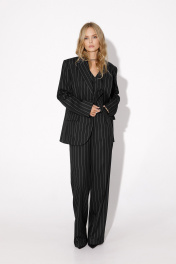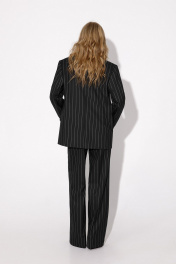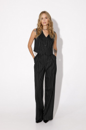 Текстильный костюм-тройка из оверсайз жакета, укороченного жилета и прямых брюк-палаццо со стрелками. Детали: жакет прямого силуэта, расширенная линия плеч, пиджачный воротник, перед с прорезными функциональными карманами, однобортная застежка на петли и пуговицы, спинка со средним швом и шлицей, рукава втачные двухшовные, жакет на подкладке. Жилет прямого силуэта с фигурным низом, талиевые вытачки, застежка на петли и пуговицы, функциональные карманы, на подкладке. Брюки с высокой посадкой на притачном поясе со шлевками, застежка на молнию и пуговицу, боковые карманы, передние половины с заутюженными стрелками и двумя небольшими складками. Длина жакета по спинке около 69 см в размерах 40-46 и около 72 см в размерах 48-52, длина рукавов около 62 см. Длина жилета по спинке около 39 см в размерах 40-46 и около 43 см в размерах 48-52. Длина брюк по боковому шву с поясом около 113 см в размерах 40-46 и около 114,5 см в размерах 48-52, длина по внутреннему шву около 82 см.