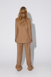 Текстильный костюм-двойка из свободного жакета со шлицами и прямых брюк-палаццо со стрелками. Детали: жакет полуприлегающего силуэта, талиевые вытачки, пиджачный воротник, застежка на две петли и пуговицы, функциональные карманы, рукава и спинка со шлицами, жакет на подкладке. Брюки с высокой посадкой на притачном поясе со шлевками, застежка на молнию и пуговицу, боковые карманы, передние половины с заутюженными стрелками и двумя небольшими складками. Длина жакета по спинке около 70 см в размерах 40-46 и около 73 см в размерах 48-52, длина рукавов около 63 см. Длина брюк по боковому шву с поясом около 113 см в размерах 40-46 и около 114,5 см в размерах 48-52, длина по внутреннему шву около 82 см.