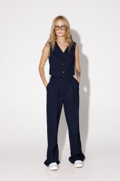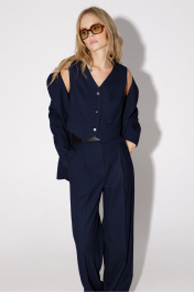 Текстильный костюм-тройка из свободного жакета со шлицами, укороченного жилета и прямых брюк-палаццо со стрелками. Детали: жакет полуприлегающего силуэта, талиевые вытачки, пиджачный воротник, застежка на две петли и пуговицы, функциональные карманы, рукава и спинка со шлицами, жакет на подкладке. Жилет прямого силуэта с фигурным низом, талиевые вытачки, застежка на петли и пуговицы, функциональные карманы, на подкладке. Брюки с высокой посадкой на притачном поясе со шлевками, застежка на молнию и пуговицу, боковые карманы, передние половины с заутюженными стрелками и двумя небольшими складками. Длина жакета по спинке около 70 см в размерах 40-46 и около 73 см в размерах 48-52, длина рукавов около 63 см. Длина жилета по спинке около 39 см в размерах 40-46 и около 43 см в размерах 48-52. Длина брюк по боковому шву с поясом около 113 см в размерах 40-46 и около 114,5 см в размерах 48-52, длина по внутреннему шву около 82 см.