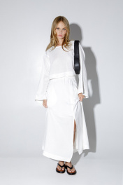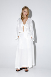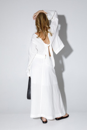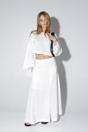 Льняной костюм-двойка из укороченной свободной блузы и макси-юбки с разрезом. Детали: блуза не имеет переда и спинки, что позволяет носить блузу разными способами- завязками на перед или на спинку. Блуза свободного покроя и длинными широкими рукавами. Юбка на притачном эластичном поясе, функциональные карманы, подкладка юбки 100% вискоза. Длина блузы около 35,5 см в размерах 40-46 и около 39,5 см в размерах 48-52, длина рукава+ плечо около 59 см+ 3см. Длина юбки по боковому шву с поясом около 94 см