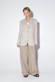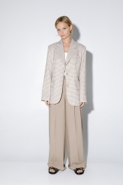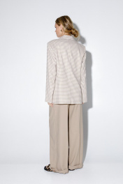 Текстильный костюм-двойка из оверсайз жакета с рисунком «гусиная лапка» и широких брюк-палаццо с небольшими складками у пояса и заутюженными стрелками. Детали: жакет прямого силуэта, расширенная линия плеч, пиджачный воротник, перед с прорезными функциональными карманами, однобортная застежка на петли и пуговицы, спинка со средним швом и шлицей, рукава втачные двухшовные, жакет на подкладке. Брюки на притачном поясе со шлевками, складки, застежка на молнию и пуговицу, боковые карманы. Задние части брюк с вытачками и имитацией карманов. Длина жакета по спинке около 69 см в размерах 40-46 и около 72 см в размерах 48-52, длина рукавов около 62 см. Длина брюк по боковому шву с поясом около 109,5 см, длина по внутреннему шву около 83 см