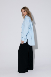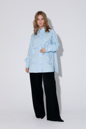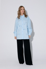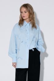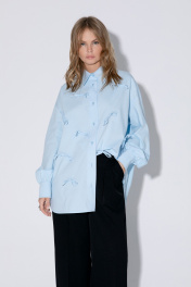 Хлопковая оверсайз рубашка с бантиками. Детали: рубашка прямого силуэта, спущенная линия плеча, застежка на петли и пуговицы, длинные рукава с притачными манжетами, фигурный низ. Длина по спинке около 78 см, длина рукава+ плечо около 56+8= 64 см.