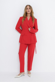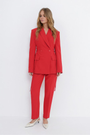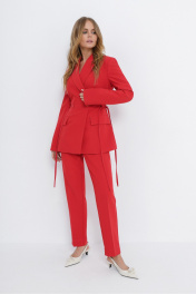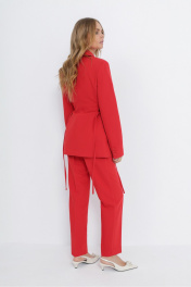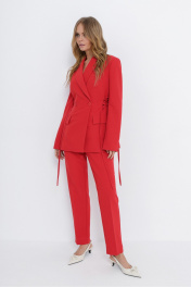 Текстильный костюм-двойка из жакета со шнуровкой с расширенной линией плеч и классических укороченный брюк со стрелками. Детали: жакет полуприлегающего силуэта, рельефы, пиджачный воротник, застежка на две петли и пуговицы, функциональные карманы, жакет на подкладке. Жакет также можно зашнуровать по бокам. Брюки на притачном поясе со шлевками, застежка на молнию и пуговицу, боковые карманы, передние половины заутюженными стрелками. Задние части брюк с вытачками, стрелками и имитацией карманов. Низ брюк с широкой подгибкой, при помощи подгибки можно регулировать длину, подвернув её. Длина по спинке около 68,5 в размерах 40-46 и около 71,5 см в размерах 48-52, длина рукавов около 63 см. Длина брюк по боковому шву с поясом около 101,5 см, длина по внутреннему шву около 74 см