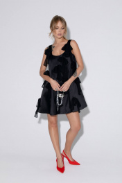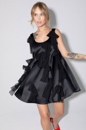 Свободное мини-платье А-силуэта с полупрозрачными бантами. Детали: A-силуэт, свободный крой, углубленная горловина переда и спинки, боковые карманы, на подкладке 100% хлопок. Длина платья от плечевого шва по переду около 81 см в размерах 40-42 и около 83 см в размерах 44-46