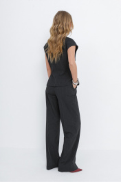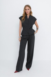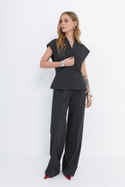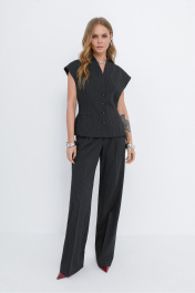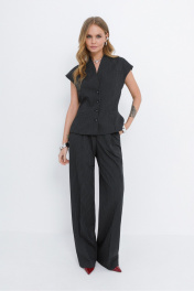 Костюм-двойка из приталенного жилета с воротником-стойкой и широких прямых брюк из текстильной ткани с рисунком «ёлочка». Детали: полуприлегающий силуэт, цельнокроеный воротник-стойка, рельефные швы переда и спинки, функциональные карманы, застежка на петли и пуговицы, жилет на подкладке. Брюки с притачным поясом со шлевками, передние половины с небольшими застроченными мягкими складками и заутюженными стрелками, застежка на молнию и пуговицу, боковые карманы. Задние части брюк с вытачками и заутюженными стрелками. Пояс брюк прямой, без резинки. Длина жилета по спинке около 54 см в размерах 40-46 и около 56 см в размерах 48-52. Длина брюк по боковому шву с поясом около 114 см в размерах 40-46 и около 115,5 см в размерах 48-52. Длина по внутреннему шву около 83 см