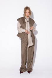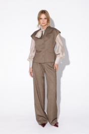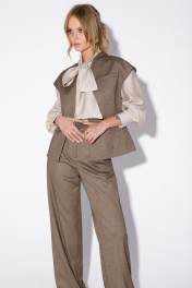 Костюм-двойка из приталенного жилета с воротником-стойкой и широких прямых брюк из текстильной ткани с рисунком «ёлочка». Детали: полуприлегающий силуэт, цельнокроеный воротник-стойка, рельефные швы переда и спинки, функциональные карманы, застежка на петли и пуговицы, жилет на подкладке. Брюки с притачным поясом со шлевками, передние половины с небольшими застроченными мягкими складками и заутюженными стрелками, застежка на молнию и пуговицу, боковые карманы. Задние части брюк с вытачками и заутюженными стрелками. Пояс брюк прямой, без резинки. Длина жилета по спинке около 54 см в размерах 40-46 и около 56 см в размерах 48-52. Длина брюк по боковому шву с поясом около 114 см в размерах 40-46 и около 115,5 см в размерах 48-52. Длина по внутреннему шву около 83 см