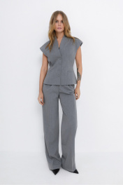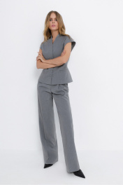 Костюм-двойка из приталенного жилета с воротником-стойкой и широких прямых брюк из текстильной ткани с рисунком «ёлочка». Детали: полуприлегающий силуэт, цельнокроеный воротник-стойка, рельефные швы переда и спинки, функциональные карманы, застежка на петли и пуговицы, жилет на подкладке. Брюки с притачным поясом со шлевками, передние половины с небольшими застроченными мягкими складками и заутюженными стрелками, застежка на молнию и пуговицу, боковые карманы. Задние части брюк с вытачками и заутюженными стрелками. Пояс брюк прямой, без резинки. Длина жилета по спинке около 54 см в размерах 40-46 и около 56 см в размерах 48-52. Длина брюк по боковому шву с поясом около 114 см в размерах 40-46 и около 115,5 см в размерах 48-52. Длина по внутреннему шву около 83 см
