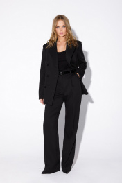 Текстильный костюм-двойка из свободного жакета и прямых брюк со стрелками. Детали: жакет свободного покроя и полуприлегающего силуэта, двубортная застежка на петли и пуговицы, отрезные бочки, пиджачный воротник, функциональные карманы, жакет на подкладке. Брюки с высокой посадкой, притачной пояс со шлевками, передние половины с небольшими застроченными мягкими складками и заутюженными стрелками, застежка на молнию и пуговицу, боковые карманы. Задние части брюк с вытачками и заутюженными стрелками. Пояс брюк прямой, без резинки. Длина жакета по спинке около 69 см в размерах 40-46 и около 72 см в размерах 48-52, длина рукавов около 62 см. Длина брюк по боковому шву с поясом около 114 в размерах 40-46 и около 115,5 см в размерах 48-52. Длина по внутреннему шву около 83 см