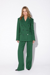 Текстильный костюм-двойка из свободного жакета и прямых брюк со стрелками. Детали: жакет свободного покроя и полуприлегающего силуэта, двубортная застежка на петли и пуговицы, отрезные бочки, пиджачный воротник, функциональные карманы, жакет на подкладке. Брюки с высокой посадкой, притачной пояс со шлевками, передние половины с небольшими застроченными мягкими складками и заутюженными стрелками, застежка на молнию и пуговицу, боковые карманы. Задние части брюк с вытачками и заутюженными стрелками. Пояс брюк прямой, без резинки. Длина жакета по спинке около 69 см в размерах 40-46 и около 72 см в размерах 48-52, длина рукавов около 62 см. Длина брюк по боковому шву с поясом около 114 в размерах 40-46 и около 115,5 см в размерах 48-52. Длина по внутреннему шву около 83 см