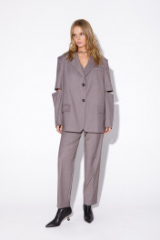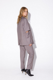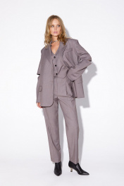 Текстильный костюм-тройка из оверсайз жакета с разрезами по рукавам, укороченного жилета и брюк со стрелками. Детали: жакет свободного покроя, прямой силуэт, застежка на петли и пуговицы, функциональные карманы, жакет на подкладке. Жилет прямого силуэта с фигурным низом, талиевые вытачки, застежка на петли и пуговицы, функциональные карманы, на подкладке. Брюки с притачным поясом со шлевками, передние половины с небольшими застроченными мягкими складками и заутюженными стрелками, застежка на молнию и пуговицу, боковые карманы. Задние части брюк с вытачками и заутюженными стрелками. Пояс брюк прямой, без резинки. Длина жакета по спинке около 71 см в размерах 40-48 и около 73 см в размерах 50-52, длина рукава около 61 см. Длина жилета по спинке около 39 см в размерах 40-46 и около 43 см в размерах 48-52. Длина брюк по боковому шву с поясом около 99 в размерах 40-46 и около 100,5 см в размерах 48-52. Длина по внутреннему шву около 69 см