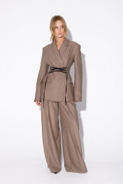 Костюм-двойка из жакета с контрастной шнуровкой и широких брюк-палаццо из текстильной ткани с пайетками. Детали: жакет полуприлегающего силуэта, рельефы, пиджачный воротник, застежка на две петли и пуговицы, функциональные карманы, жакет на подкладке. Жакет также можно зашнуровать по бокам. Брюки с притачным поясом со шлевками, складки у пояса, застежка на молнию и пуговицу, боковые карманы. Задние части брюк с вытачками и имитацией карманов. Длина жакета по спинке около 68,5 в размерах 40-46 и около 71,5 см в размерах 48-52, длина рукавов около 63 см. Длина брюк по боковому шву с поясом около 109,5 см, длина по внутреннему шву около 83 см