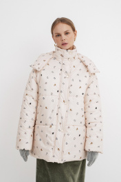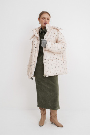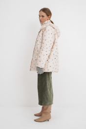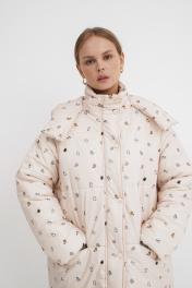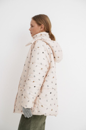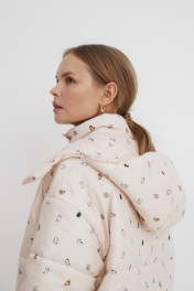 Стеганая оверсайз куртка с принтом. Детали: прямой силуэт, свободый покрой, спущенная линия плеча, капюшон, функциональные карманы, застежка на молнию и пробивные металлические кнопки, куртка на утепленной синтепоном подкладке. Наполнитель куртки ISOSOFT толщиной 200 г/м2. Длина по спинке около 71 см в размерах 40-46 и около 73 см в размерах 48-52, длина рукава+ плечо около 53+8 см