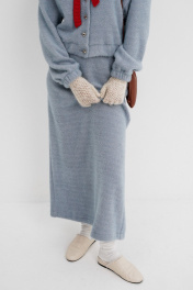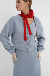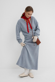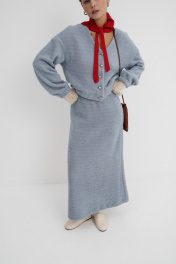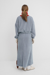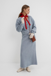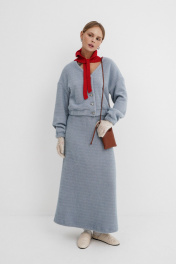 Костюм-двойка из укороченного бомбера и юбки из пушистой ткани. Детали: спущенная линия плеча, V-образный вырез горловины переда, застежка на петли и декоративные пуговицы, рукава и низ бомбера на резинке, подкладка. Юбка трапециевидного силуэта, пояс на резинке и без застежки, низ юбки с разрезом, без подкладки. Длина бомбера по спинке около 47 см в размерах 40-46 и около 50 см в размерах 48-52, длина рукава со спущенным плечом около 47+13 см. Длина юбки по боковому шву с поясом около 92 см.