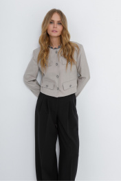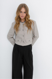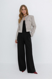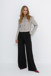 Костюм-двойка из укороченного жакета в стиле «милитари» и брюк-палаццо. Детали: жакет прямого силуэта, расширенная линия плеч, талиевые вытачки, круглая горловина, без воротника, рукава втачные со шлицами, имитация карманов, застежка на петли и декоративные пуговицы, на подкладке. Широкие брюки-палаццо с небольшими складками у пояса и заутюженными стрелками, притачной пояс со шлевками, застежка на молнию и пуговицу, боковые карманы. Задние части брюк с вытачками и имитацией карманов. Длина жакета по спинке около 42,5 см в размерах 40-46 и около 45,5 см в размерах 48-52, длина рукава около 61 см. Длина брюк по боковому шву с поясом около 109,5 см, длина по внутреннему шву около 83 см