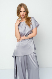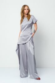 Атласный костюм-двойка из приталенной асимметричной блузы и широких брюк. Детали: туника приталенного силуэта, широкая горловина переда и спинки, талиевые вытачки, фигурный низ, потайная застежка-молния в среднем шве спинки. Брюки с высокой посадкой, передние половины брюк с двумя складками, эластичный пояс-резинка, боковые карманы, без застежки. Длина туники по спинке около 64,5 см. Длина брюк по боковому шву с поясом около 108 см, длина брюк по внутреннему шву около 79,5 см