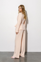 Прямые широкие брюки со стрелками. Детали: высокая посадка, притачной пояс со шлевками, передние половины с небольшими застроченными мягкими складками и заутюженными стрелками, застежка на молнию и пуговицу, боковые карманы. Задние части брюк с вытачками и заутюженными стрелками. Пояс брюк прямой, без резинки. Длина по боковому шву с поясом около 114 в размерах 40-46 и около 115,5 см в размерах 48-52. Длина по внутреннему шву около 83 см. Приобрести блузу с фото можно по арт. 6636.