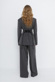 Костюм-двойка из жакета с контрастной шнуровкой и широких брюк-палаццо из текстильной ткани с рисунком «ёлочка». Детали: жакет полуприлегающего силуэта, рельефы, пиджачный воротник, застежка на две петли и пуговицы, функциональные карманы, жакет на подкладке. Жакет также можно зашнуровать по бокам. Брюки с притачным поясом со шлевками, складки у пояса, застежка на молнию и пуговицу, боковые карманы. Задние части брюк с вытачками и имитацией карманов. Длина жакета по спинке около 68,5 в размерах 40-46 и около 71,5 см в размерах 48-52, длина рукавов около 63 см. Длина брюк по боковому шву с поясом около 109,5 см, длина по внутреннему шву около 83 см
