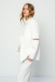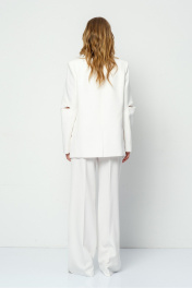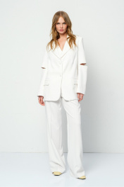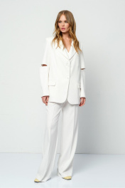 Текстильный костюм-двойка из оверсайз жакета с разрезами по рукавам и прямых широких брюк. Детали: жакет свободного покроя, прямой силуэт, застежка на петли и пуговицы, функциональные карманы, жакет на подкладке. Брюки с высокой посадкой на притачном поясе со шлевками, застежка на молнию и пуговицу, боковые карманы, передние половины с заутюженными стрелками и небольшими складками. Пояс брюк прямой, без резинки. Длина жакета по спинке около 71 см в размерах 40-48 и около 73 см в размерах 50-52, длина рукава около 61 см. Длина брюк по боковому шву с поясом около 112 см в размерах 40-46 и около 113 см в размерах 48-52. Длина брюк по внутреннему шву около 81 см
