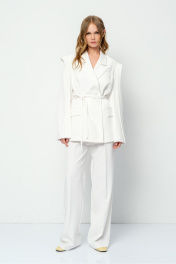 Текстильный костюм-двойка из свободного жакета с декором и прямых брюк со стрелками. Детали: жакет свободного покроя и полуприлегающего силуэта, двубортная застежка на петли и пуговицы, отрезные бочки, пиджачный воротник, функциональные карманы, съемный пояс. Жакет на подкладке. Брюки с высокой посадкой, притачной пояс со шлевками, передние половины с небольшими застроченными мягкими складками и заутюженными стрелками, застежка на молнию и пуговицу, боковые карманы. Задние части брюк с вытачками и заутюженными стрелками. Пояс брюк прямой, без резинки. Длина жакета по спинке около 69 см в размерах 40-46 и около 72 см в размерах 48-52, длина рукавов около 62 см. Длина брюк по боковому шву с поясом около 114 в размерах 40-46 и около 115,5 см в размерах 48-52. Длина по внутреннему шву около 83 см