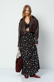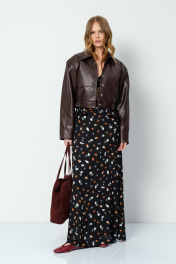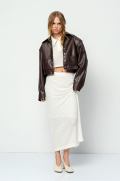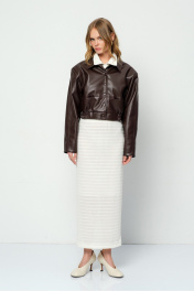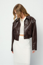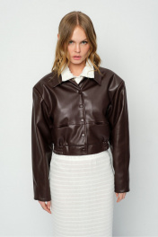 Укороченная куртка-бомбер из экокожи. Детали: прямой силуэт, воротник, пояс переда и спинки на резинке, застежка на кнопки, рукава длинные с высокими обтачками по низу, функциональные карманы, спинка со средним швом, куртка на подкладке. Длина по спинке с поясом около 46 см в размерах 40-46 и около 50 см в размерах 48-52, длина рукава около 57 см+ расширенное плечо