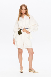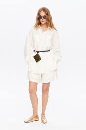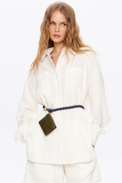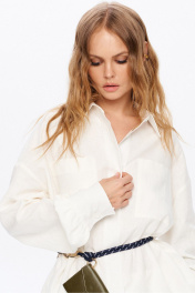 Льняная свободная рубашка. Детали: рубашка прямого силуэта, спущенная линия плеча, застежка на петли и пуговицы, длинные рукава с притачными манжетами, фигурный низ. Длина по спинке около 78 см, длина рукава+ плечо около 55+7= 62 см