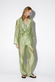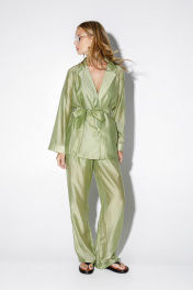 Костюм-двойка в пижамном стиле из свободной блузы и брюк из полупрозрачной вискозы. Детали: блуза прямого силуэта, застежка на петли и пуговицы, рукава втачные длинные с высокой подгибкой, съемный пояс, без подкладки. Брюки на притачном поясе, складки у пояса, застежка на молнию и пуговицу, боковые карманы, пояс без резинок, брюки на подкладке 100% вискоза. Длина блузы по спинке около 71 см в размерах 40-46 и около 73 см в размерах 48-52. Длина рукава около 60 см. Длина брюк по боковому шву с поясом около 107 см, длина по внутреннему шву около 79 см