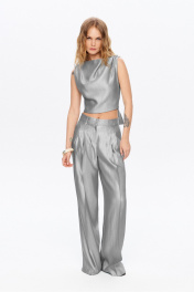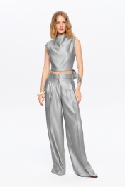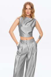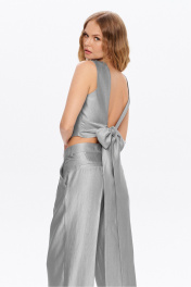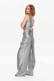 Костюм-двойка из топа с открытой спинкой и брюк-палаццо. Детали: полуприлегающий силуэт, вырез переда- «качели», топ на подкладке, при помощи поясов можно регулировать прилегание. Также пояса можно завязать спереди. Брюки с притачным поясом со шлевками, складки у пояса, застежка на молнию и пуговицу, боковые карманы. Задние части брюк с вытачками и имитацией карманов. Длина топа по спинке около 42 см в размерах 40-46 и около 43,5 см в размерах 48-52. Длина брюк по боковому шву с поясом около 109 см, длина по внутреннему шву около 82 см
