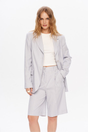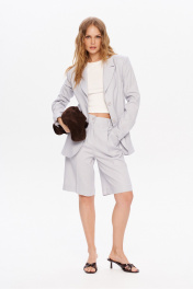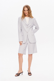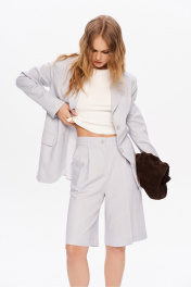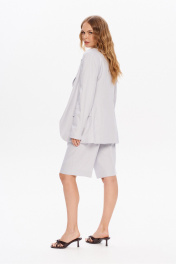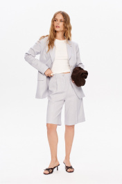 Льняной костюм-двойка из полуприлегающего жакета и шорт-бермуд. Детали: пиджачный воротник, талиевые вытачки, функциональный нагрудный карман, два прорезных кармана с клапанами, застежка на петли и пуговицы, спинка со средним швом и шлицей, рукава втачные двухшовные со шлицами по низу, жакет на хлопковой подкладке. Шорты с высокой посадкой, притачной пояс со шлевками и резинкой по спинке, застежка на молнию и пуговицу, боковые карманы. Длина жакета по спинке около 69 см в размерах 40-46 и около 72 см в размерах 48-52, длина рукавов около 62 см. Длина шорт по боковому шву с поясом около 57 см в размерах 40-46 и около 58,5 см в размерах 48-52, длина по внутреннему шву около 27 см