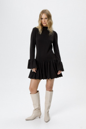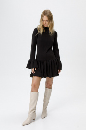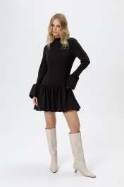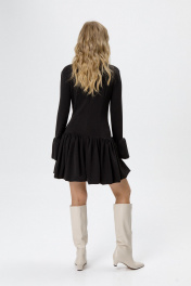 Трикотажное мини-платье с юбкой-баллон. Детали: прилегающий силуэт, цельнокроеный воротник, талиевые и нагрудные вытачки, застежка на потайную молнию по спинке, рукава длинные с фигурной манжетой
