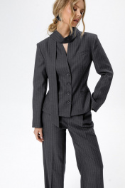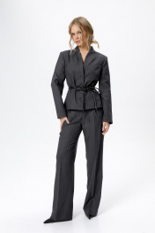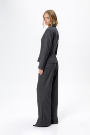 Костюм-двойка из приталенного жакета со съемным шарфиком и широких прямых брюк. Детали: жакет полуприлегающего силуэта, цельнокроеный воротник-стойка, рельефные швы переда и спинки, функциональные карманы, застежка на петли и пуговицы, на подкладке. В комплекте съемный шарфик. Брюки с притачным поясом со шлевками, передние половины с небольшими застроченными мягкими складками и заутюженными стрелками, застежка на молнию и пуговицу, боковые карманы. Задние части брюк с вытачками и заутюженными стрелками. Пояс брюк прямой, без резинки. Длина жакета по спинке около 56 см в размерах 40-46 и около 58,5 см в размерах 48-52, длина рукава около 62,5 см. Длина брюк по боковому шву с поясом около 114 см в размерах 40-46 и около 115,5 см в размерах 48-52. Длина по внутреннему шву около 83 см
