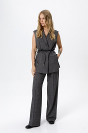 Широкие прямые брюки в клетку. Детали: брюки с притачным поясом со шлевками, передние половины с небольшими застроченными мягкими складками и заутюженными стрелками, застежка на молнию и пуговицу, боковые карманы. Задние части брюк с вытачками и заутюженными стрелками. Пояс брюк прямой, без резинки. Длина брюк по боковому шву с поясом около 114 см в размерах 40-46 и около 115,5 см в размерах 48-52. Длина по внутреннему шву около 83 см