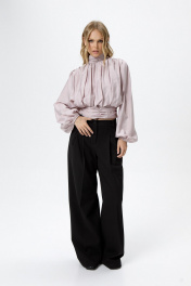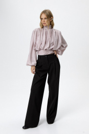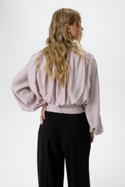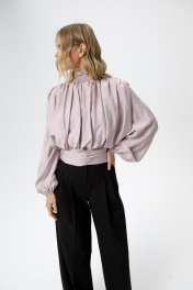 Укороченная блуза из вискозного текстиля. Детали: блуза приталенного силуэта, перед и спинка свободного покроя, пояс блузы со сборкой, расширенные плечи, сборки по плечам и горловине, застёжка на потайную молнию в боковом шве, воротник стойка со сборкой и застёжкой на навесные петли и пуговицы, втачные расширенные к низу рукава с резинкой по низу. Длина изделия по спинке около 48 см, длина рукава около 65 см.