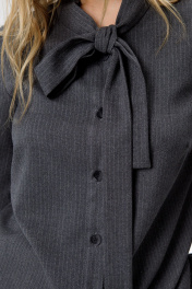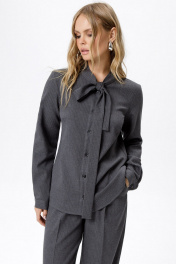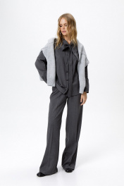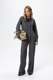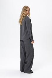 Костюм-двойка из рубашки и широких прямых брюк. Детали: рубашка прямого силуэта, застежка на петли и пуговицы, длинные рукава с притачными манжетами. Брюки с высокой посадкой, притачной пояс со шлевками, передние половины с небольшими застроченными мягкими складками и заутюженными стрелками, застежка на молнию и пуговицу, боковые карманы. Длина рубашки по спинке около 63 см в размерах 40-46 и около 65 см в размерах 48-52. Длина рукава около 61 см. Длина брюк по боковому шву с поясом около 113 в размерах 40-46 и около 114,5 см в размерах 48-52, длина по внутреннему шву около 82 см
