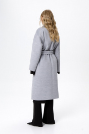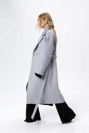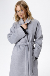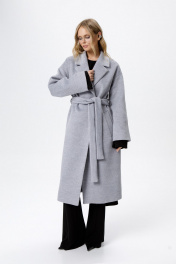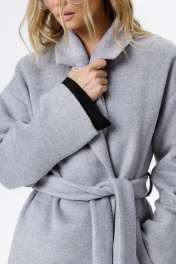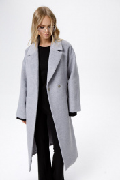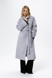 Свободное пальто-халат со съемным поясом. Детали: прямой силуэт, спущенная линия плеча, перед с прорезными карманами, пиджачный воротник, двубортная застежка на пришивные кнопки, рукава длинные, съемный пояс со шлевками, пальто на подкладке. Длина по спинке около 114 см. Длина рукава+спуск плеча около 62 см