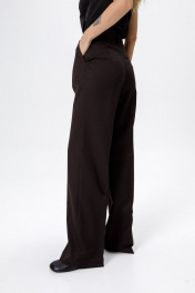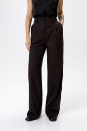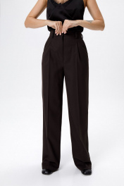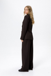 Классический костюм-двойка из приталенного жакета и прямых широких брюк со стрелками. Детали: приталенный силуэт, пиджачный воротник, функциональные карманы, двубортная застежка на петли и пуговицы, спинка со средним швом, втачные двухшовные рукава, жакет на подкладке. Брюки с высокой посадкой на притачном поясе со шлевками, передние половины с небольшими застроченными мягкими складками и заутюженными стрелками, застежка на молнию и пуговицу, боковые карманы. Длина жакета по спинке около 68 см в размерах 40-46 и около 71 см в размерах 48-52, длина рукавов около 62 см. Длина рукава около 61 см. Длина брюк по боковому шву с поясом около 114 см в размерах 40-46 и около 115,5 см в размерах 48-52. Длина по внутреннему шву около 83 см