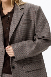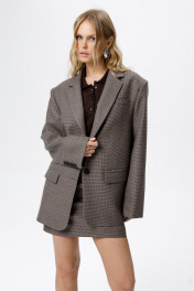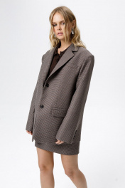 Костюм-двойка из оверсайз жакета и мини-юбки из текстильной ткани в клетку. Детали: жакет прямого силуэта, расширенная линия плеч, пиджачный воротник, перед с функциональными карманами, однобортная застежка на петли и пуговицы, спинка со средним швом и шлицей, рукава втачные двухшовные, жакет на подкладке. Юбка на притачном поясе, застежка сзади на потайную молнию, юбка на подкладке. Длина жакета по спинке около 71 см в размерах 40-46 и около 72 см в размерах 48-52, длина рукавов около 62 см. Длина юбки по боковому шву с поясом около 46 см в размерах 40-46 и около 49 см в размерах 48-52 см