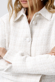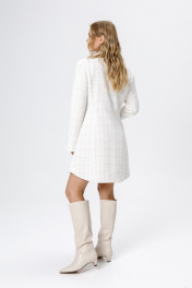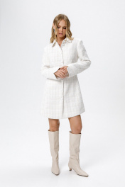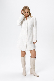 Приталенное платье из фактурной ткани. Детали: полуприлегающий силуэт, перед с функциональными карманами, однобортная застежка на петли и пуговицы, фигурный низ, рукава втачные с разрезами по низу, платье на подкладке.