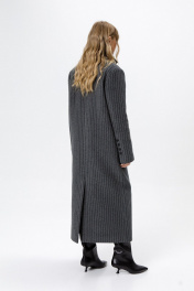 Пальто свободного силуэта из ткани в полоску. Детали: прямой силуэт, свободный покрой, расширенная линия плеч, пиджачный воротник, двубортная застежка на петли и пуговицы, рукава втачные со шлицей, функциональные карманы, спинка со средним швом и высокой шлицей, пальто на подкладке. Длина по спинке около 124,5 см, длина рукава около 61 см