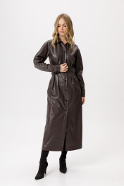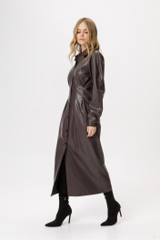 Платье из экокожи длины миди. Детали: полуприлегающий силуэт, застроченные складки по переду, спинка на резинке, рубашечный воротник, рукава покроя реглан, застёжка на петли и пуговицы, платье на подкладке. Длина платья по спинке около 125 см, длина рукава около 70 см