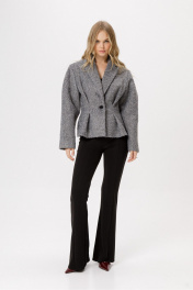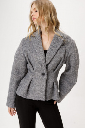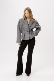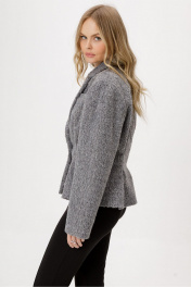 Приталенный жакет о-образного силуэта из утепленной фактурной ткани. Детали: полуприлегающий силуэт, пиджачный воротник, застежка на петлю и пуговицу, жакет на подкладке Длина по спинке около 56,5 см в размерах 40-46 и около 58 см в размерах 48-52, длина рукава около 60,5 см