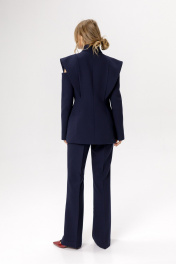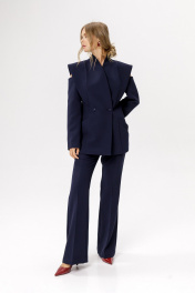Приталенный двубортный жакет. Детали: полуприлегающий силуэт, цельнокроеный воротник-стойка, двубортная застёжка на петли и пуговицы, рельефные швы переда и спинки с декоративным элементом, рукава длинные с вырезами по верху, функциональные карманы, жакет на подкладке. Длина изделия по спинке в размерах 40-46 около 71 см, в размерах 48-52 около 74 см, длина рукава около 61 см. Приобрести брюки с фото можно по арт. 6343
